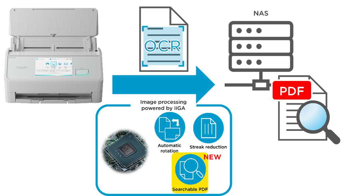 Powered by the next-generation SoC “iiGA,” the ScanSnap iX2500 can now save searchable PDFs directly to folders on a network HDD (NAS) without the need for a PC or smartphone.